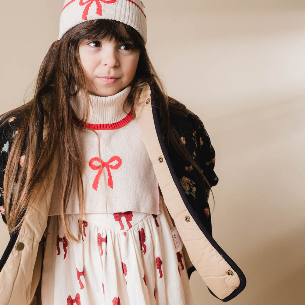 Strikket halsedisse med sløjfe. Lavet i blød, økologisk bomuld. Matcher perfekt med Leonora-beanien.