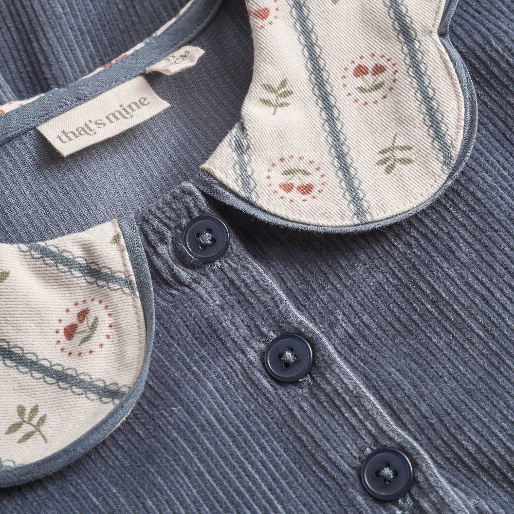 Rosalia-kjole i fløjl med krave og knaplukning foran. Katteformede lommer. Elastik forneden på ærmerne.