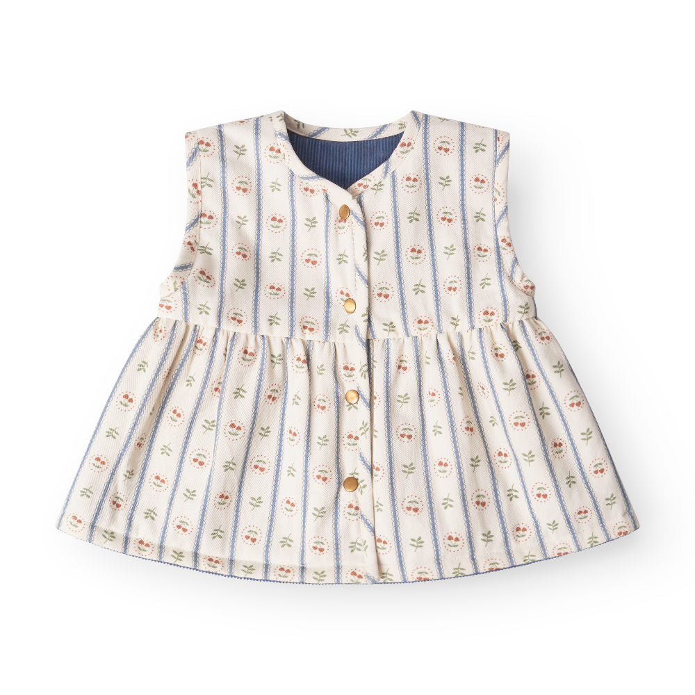 Fin vendbar vest i fløjl og printet vævning. Trykknapper foran til lukning og hjerte-patchwork på ryggen. Lille lomme og rynker omkring taljen.