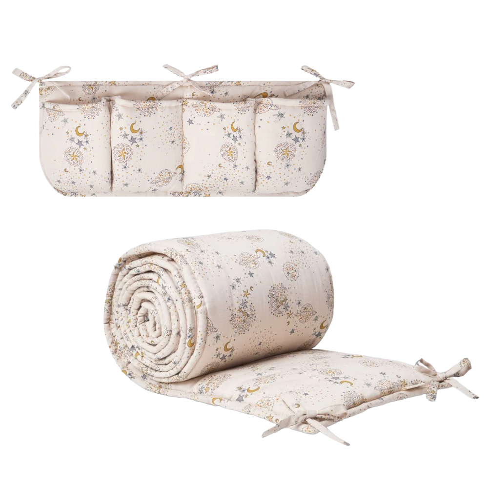 For at dit barn ikke støder ind i sengen eller mister sutten, har That's Mine designet denne sengerand som skaber ro og skærmer for forstyrrelser, så dit barn sover godt. Snorene gør at du selv kan vælge hvor den skal bindes fast - både oppe og nede. Sengeranden fra That's Mine er lavet af genanvendt polyester og beskytter barnet for stød mod sengen. Den er designet så den lille kan ånde igennem det, hvis barnet får lagt hovedet mod den. Det findes i mange smukke prints og kan sammensættes med andre produkter såsom sengetøj, stræklagner og sengelomme fra That's Mine.