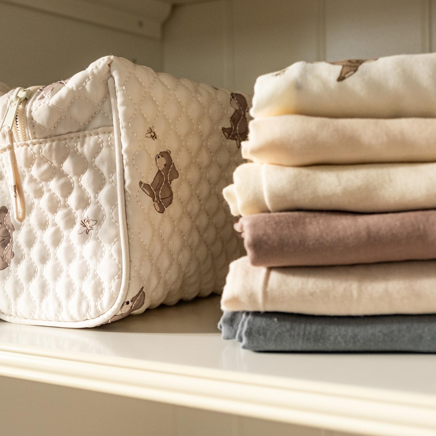 Med denne toilettaske kan du holde styr på alt the nødvendige. Perfekt for de små til overnatning eller til at holde de små ting samlet i en toilettaske. Denne toilettaske er designet med et fint quiltet mønster uden på. Toilettasken kommer med et stort rum og kan lukkes med en lynlås hvor man kan holde fast i en strop i den ene ende. Toilet tasken er udstyret med 2 små lommer indeni til diverse små ting.